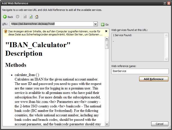 5. In the "Add Web Reference" dialog, reference the service (https://ssl.ibanrechner.de/soap/?wsdl ) and choose a suitable name space (e. g., IbanService).